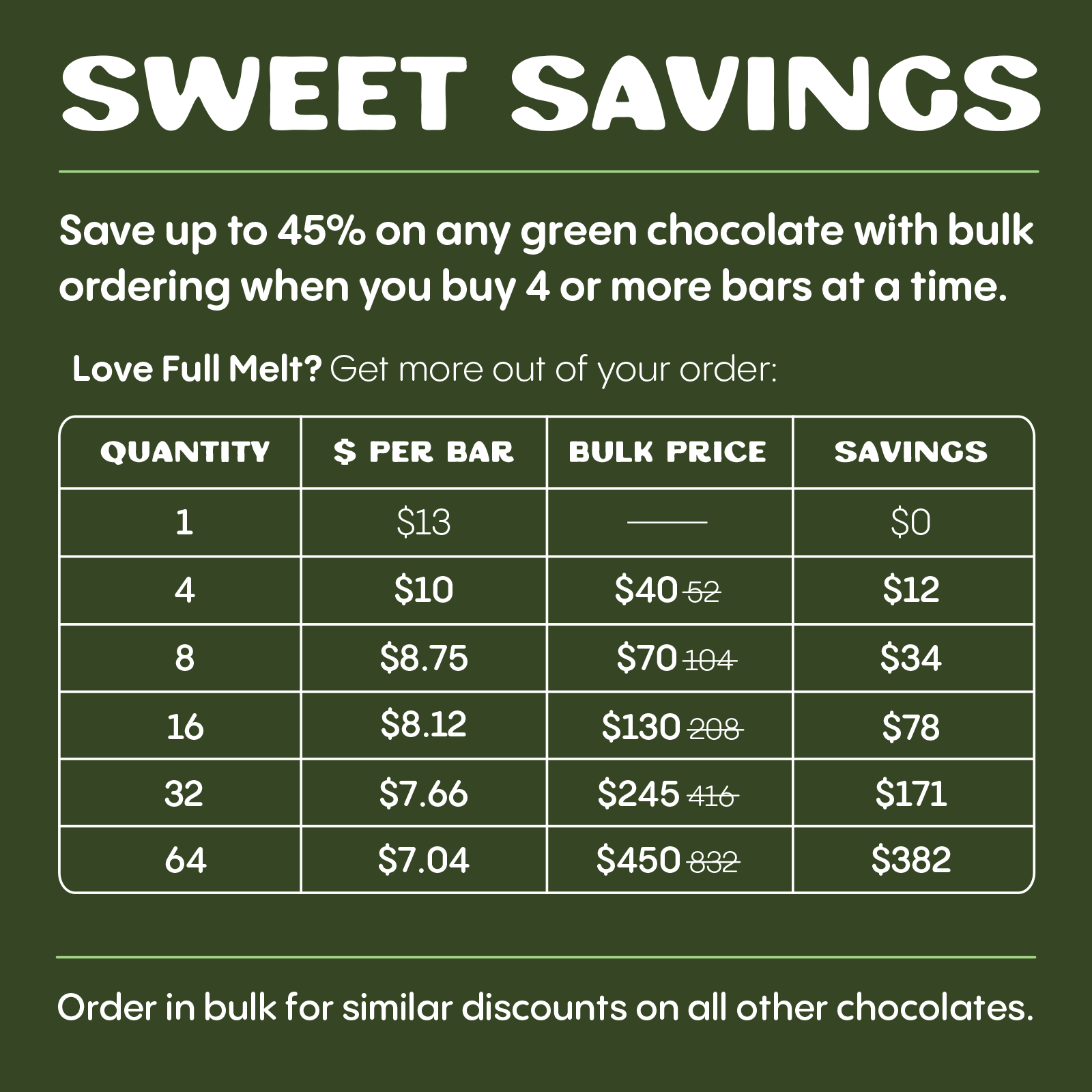 **Save up to 45% when you buy four or more West Coast chocolates at a time. Price per chocolate lowers significantly as you increase the number of bars in your order. Similar discounts apply to all other chocolates.**